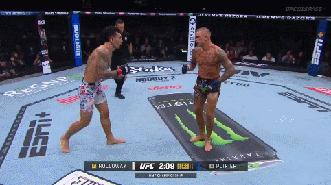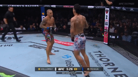 But what turns this from a nasty surprise into a knockdown is the fact that Holloway follows up. He doesn’t just see Poirier’s right hand leaving his chin and think “he’ll be open for the left hook now.” He throws the left hook knowing that Poirier will defend it. He forces Poirier to defend it, which not only creates an opening in Poirier’s guard, but generates the tempo Holloway needs to exploit it.